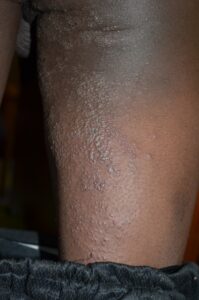 This is herpes zoster infection also known as “shingles”. Varicella zoster virus (VZV) lies dormant in the posterior root ganglion after chicken pox. Reactivation causes the virus to travel down the cutaneous nerves to infect epidermal cells in the skin. The presence of pain and the dermatomal distribution is classical. As the rash is less than 72 hours old it is worthwhile treating with antiviral medication such as aciclovir, famciclovir or valaciclovir, if available. They inhibit VZV replication and reduce the severity and duration of the rash. Postherpetic neuralgia (pain which persists >3months after the rash has resolved) is more common in elderly patients and may respond to tricyclic antidepressant drugs, which should be started early if possible.