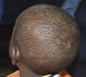 The diagnosis is tinea capitis (scalp “ringworm”). This is a cutaneous fungal infection which invades the hair shaft and is often due to Trichophyton tonsurans (caught from other children) or Microsporum canis (caught from kittens or puppies). Without treatment it gets better spontaneously at puberty. After puberty it only occurs in patients with underlying immunosuppression.Treatment of choice is oral griseofulvin 15-20mg/kg/day for 6 weeks. Additional application of a topical antifungal, during the early stages of treatment, may reduce the risk of transmission. Terbinafine is an unlicensed alternative, but may not be as effective for infections with M. canis. The only oral antifungal available in the department is ketoconazole, so he is prescribed this and topical Whitfield’s ointment. His parents then tell you that his elder sister was treated with the same treatment successfully earlier this year.