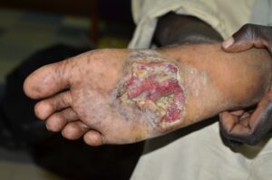 This is a deep, irregulary shaped ulcer on the mid-sole of the right foot. There is no cm scale in the photo, but it must be at least 5 cm in diameter. The ulcer looks relatively clean. The base of the ulcer comprises of red fleshy tissue. It is not possible to see bone or tendons.