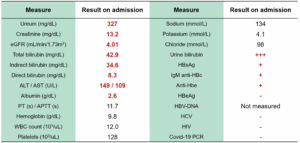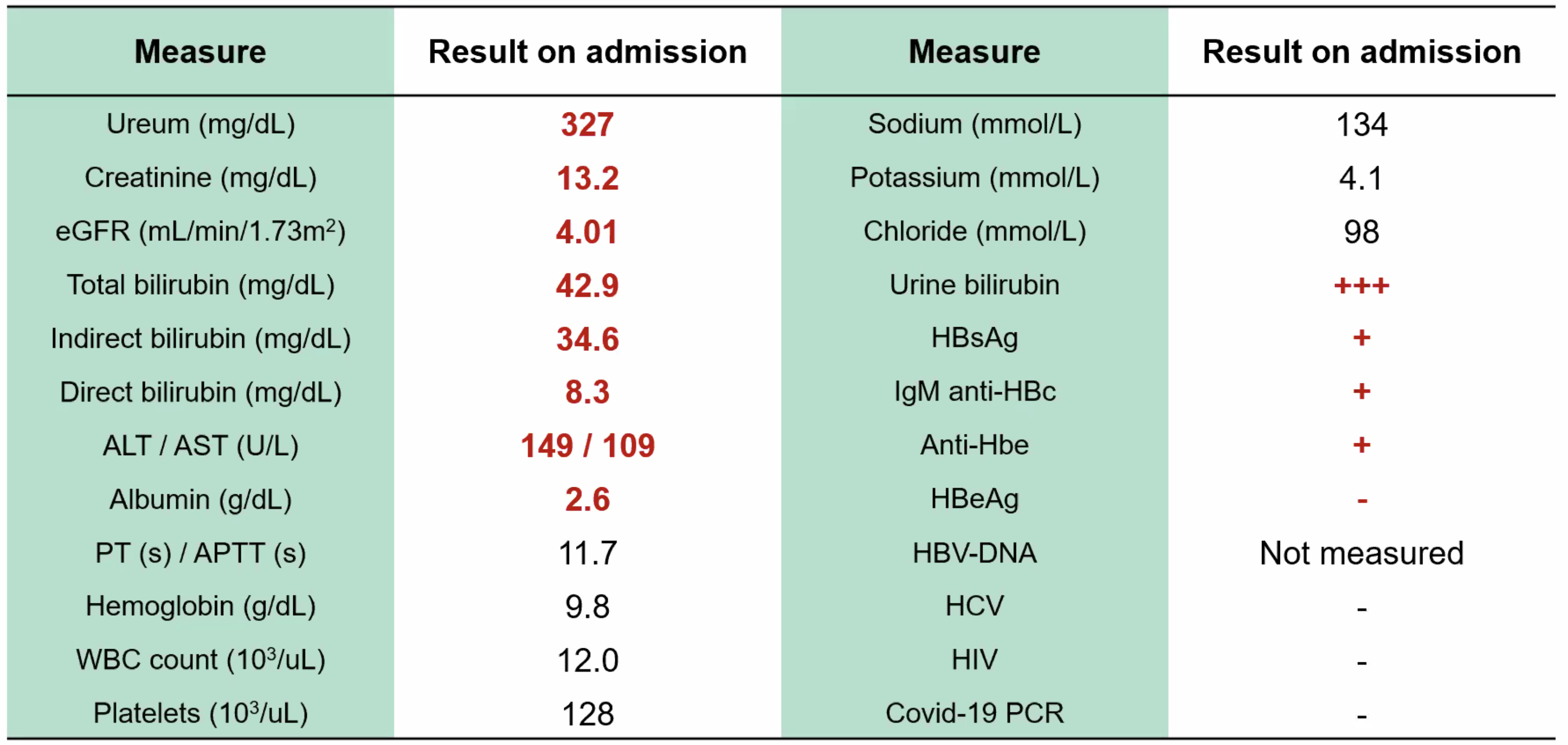 On transfer he was initially alert, deeply jaundiced, apyrexial, BP 107/53, but becoming obtunded. Some upper abdominal tenderness was noted. Ultrasound showed normal liver oultline no obstruction, thickened gallbladder wall with sludge. Elastography suggested severe liver fibrosis. Blood test results are shown (click to enlarge).